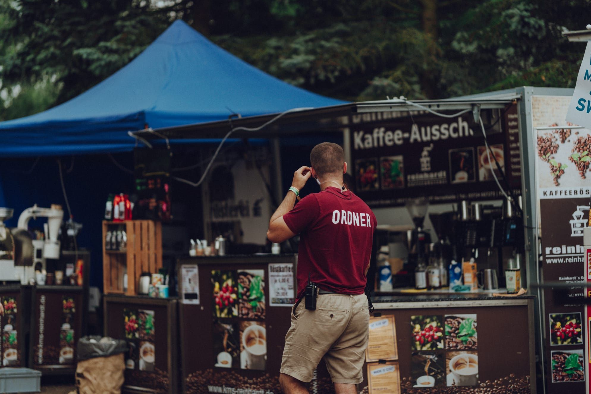 Du Findest die Ordner auf dem Festivalgelände, erkennbar an roten T-Shirts mit der Aufschrift "Ordner" oder roten Pullovern mit der Aufschrift "Crew".